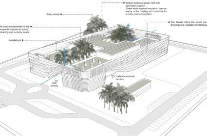 Located in Riyadh, with a specific desert climate, the architectural proposal implements two oases within the courtyards to improve air quality, shading and humidity control. Recognising the importance of vegetation in improving the microclimate, green roofs are installed on both volumes. These roofs not only improve insulation and thermal inertia, but also contribute to enriching the ecosystem, creating a sustainable and comfortable environment for research and collaboration.